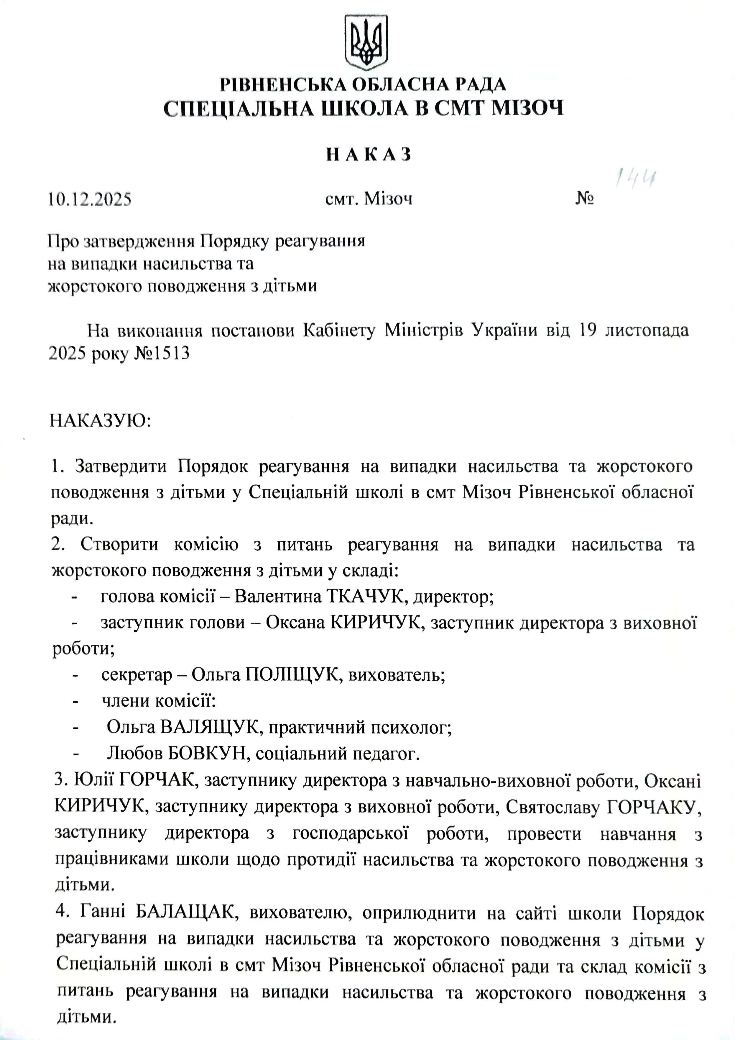 Порядок реагування на випадки насильства та жорстокого поводження з дітьми